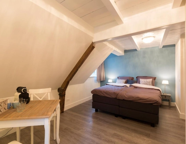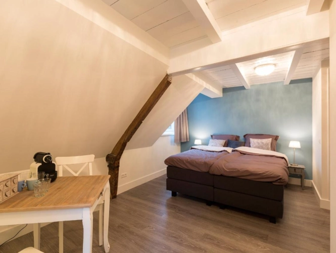Een lichte en ruime kamer geschikt voor twee personen, gelegen aan de voorzijde van ons pand. De Zomer kamer heeft uitzicht op het horeca plein en de winkelstraat. De Zomer kamer heeft een eigen badkamer met douche en toilet.